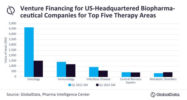 종양은 1분기 15억 달러로, 상위 5개 치료 분야 중 가장 많은 벤처 자금을 확보했다.