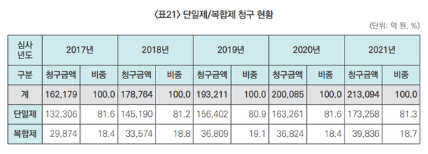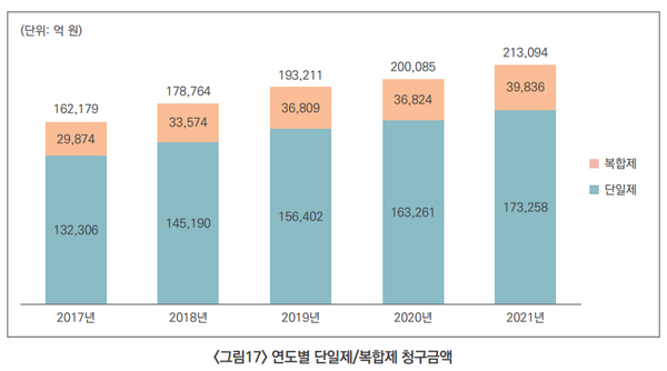 청구 금액 변화에서 복합제의 건보 청구액은 꾸준히 증가해 3조 9836억원, 단일제 청구액은 17조 3258억에 달했다.