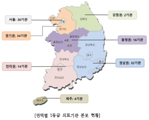 종합점수에 따른 등급은 1등급 56.7%로 전국 모든 권역에 분포했다. 평가는 ▲전문인력 구성여부 및 뇌졸중 집중치료실(Stroke Unit) 운영을 보는 진료환경 영역, ▲뇌영상 검사, 혈전용해제 투여, 조기재활 평가, 연하장애 선별검사 실시율 등을 평가하는 진료과정 영역, ▲입원 중 폐렴 발생률을 평가하는 진료결과 영역으로 구성돼 있다.