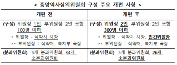 이와 함께 중앙약심 위원 규모를 기존 99명에서 267명으로 확대해 위촉했으며, 소분과위원회를 기존 34개에서 26개로 정비했다.