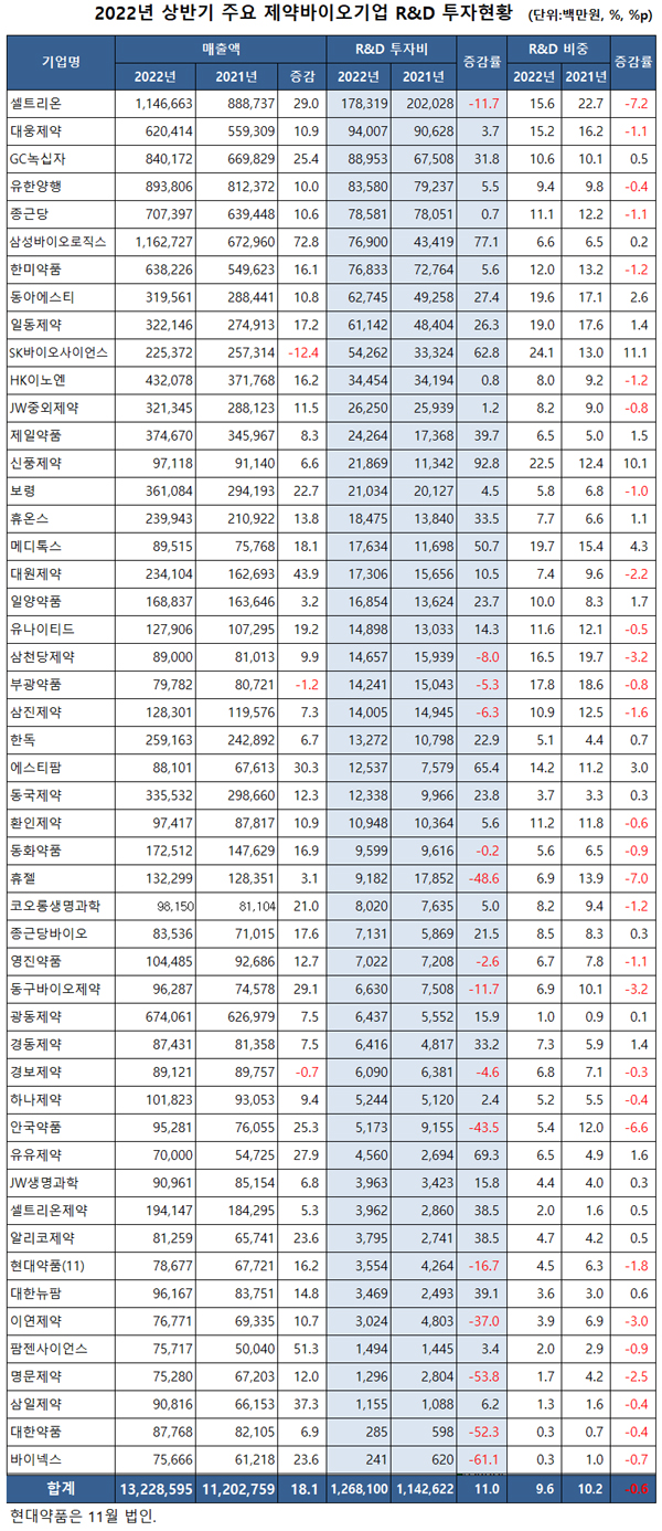메디팜스투데이가 금융감독원 전자공시시스템에 제출된 2022년 반기보고서를 토대로 국내 주요 상장 제약바이오기업 50개사의 R&D 투자 금액을 살펴봤다.