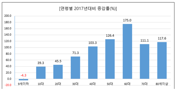 연령대별로 살펴보면 60대가 2017년 4만 3851명에서 2021년 12만 576명으로 175.0% 가장 큰 폭으로 증가하였고, 50대가 126.4%, 80세 이상이 117.6% 순으로 나타났다.