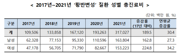 ‘황반변성’ 환자의 건강보험 총진료비는 2017년 1천 95억 원에서 2021년 3천 170억 원으로 2017년 대비 189.5%(2천 75억 원) 증가하였고, 연평균 증가율은 30.4%로 나타났다.