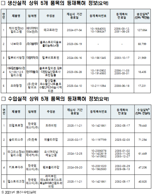 특히 생산·수입실적 상위 각 5개 품목에 대해 등재특허 외에 해당 성분 관련 미등재된 특허정보도 추가로 제공한다.