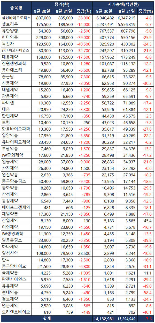 이어 유유제약 -49.0%, 오리엔트바이오 -40.1%, 일동홀딩스 -39.8%, 종근당바이오 -31.1%, 신풍제약 -30.3%, 동화약품 -29.5%, 팜젠사이언스 -29.4%, 한올바이오파마 -27.8%, 한미약품 -25.9%, 경보제약 -24.7%, GC녹십자 -24.3%, 일양약품 -22.2%, SK바이오사이언스 -21.6%, 일동제약 -21.0% 등 총 15개 종목이 20% 이상 줄어든 것으로 나타났다.