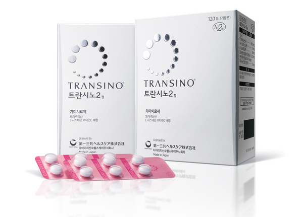 트란시노2정은 기존 트란시노정의 복용횟수를 1일 3회에서 1일 2회로 개선한 기미치료제로, 트라넥삼산과 L-시스테인과 아스코르브산, 판토텐산칼슘타입S, 피리독신염산염 성분의 복합제인 일반의약품이다.