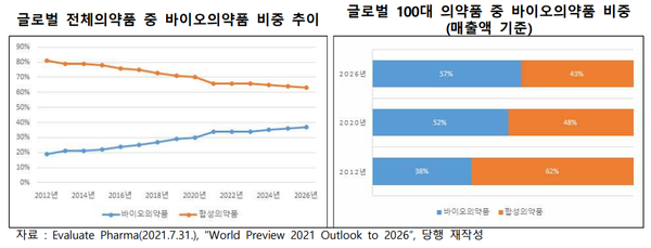 보고서는 글로벌 매출 상위 100대 의약품 중 바이오의약품 매출 비중은 2020년 기준 52%이며, 2026년에는 57%를 차지할 것으로 예상했다.