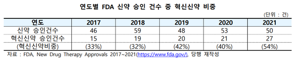 지난해 FDA에서 승인된 신약 50건 중 혁신신약 비중은 54%로 최근 5년간 증가 추세를 보였으며, 향후 혁신신약의 시장 출시는 더욱 활발해질 것으로 전망된다.