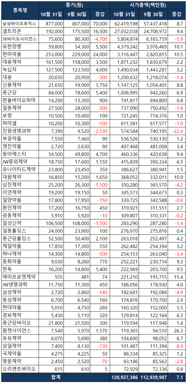 메디팜스투데이가 의약품업종 46개 종목의 시가총액(이하 시총)을 살펴본 결과 10월 마지막날인 31일 종가기준 시총규모는 120조 9274억원으로, 전월 마지막 거래일인 9월 30일 112조 9400억원보다 7.1% 증가했다. 금액으로는 7조 9874억원이 늘었다.