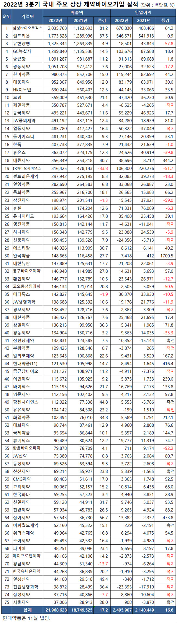 메디팜스투데이가 금융감독원에 제출된 75개 국내 상장 제약바이오기업의 2022년 3분기보고서를 살펴본 결과 전체 누적매출액은 21조 9686억원으로 전년 동기 대비 17.2% 증가했고, 영업이익은 2조 4959억원으로 16.6% 증가해 두 자릿수 성장률을 보였다.