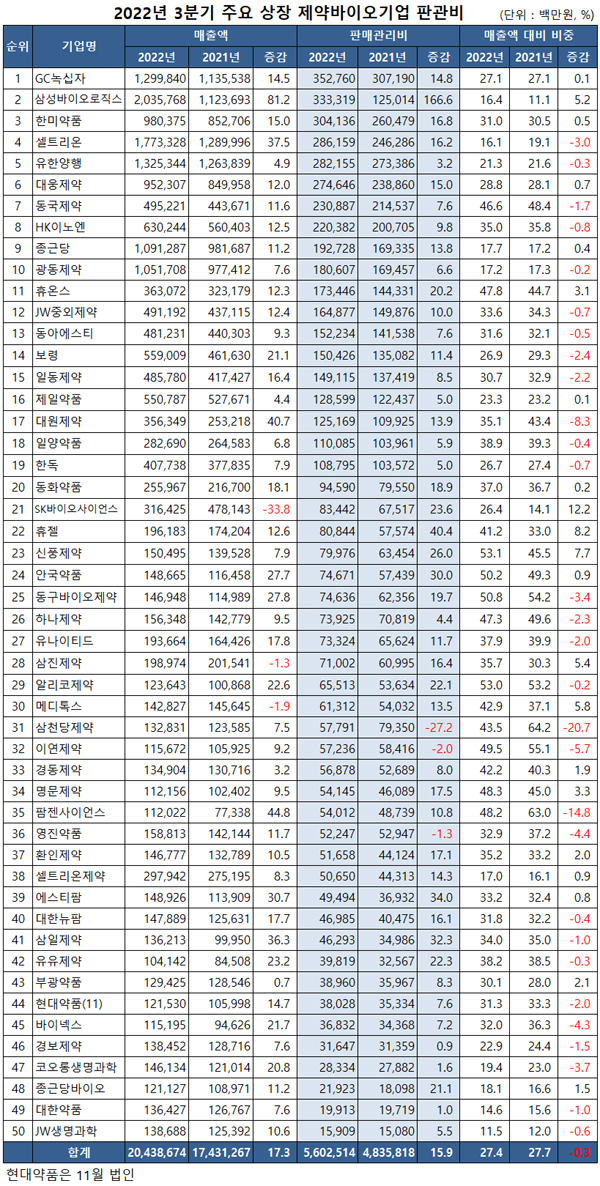 GC녹십자는 판관비를 가장 많이 지출한 기업으로 집계됐으며, 삼성바이오로직스는 전년 동기 대비 판관비가 가장 많이 늘어났다. 신풍제약 등 4곳은 매출액의 절반 이상을 판관비로 지출한 것으로 확인됐다.