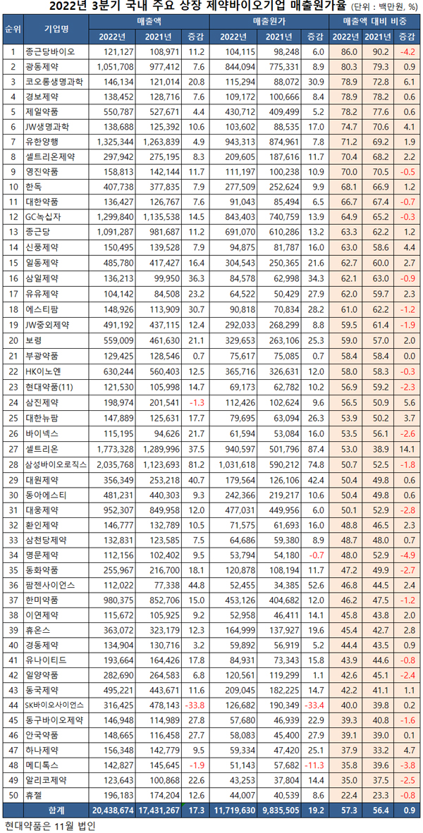 메디팜스투데이가 금융감독원에 제출된 2022년 분기보고서를 토대로 국내 상장 제약바이오기업 50개사의 매출원가율을 살펴본 결과 평균 매출액 대비 비중은 57.3%로, 전년 동기 56.4%에 비해 0.9%p 증가한 것으로 조사됐다.