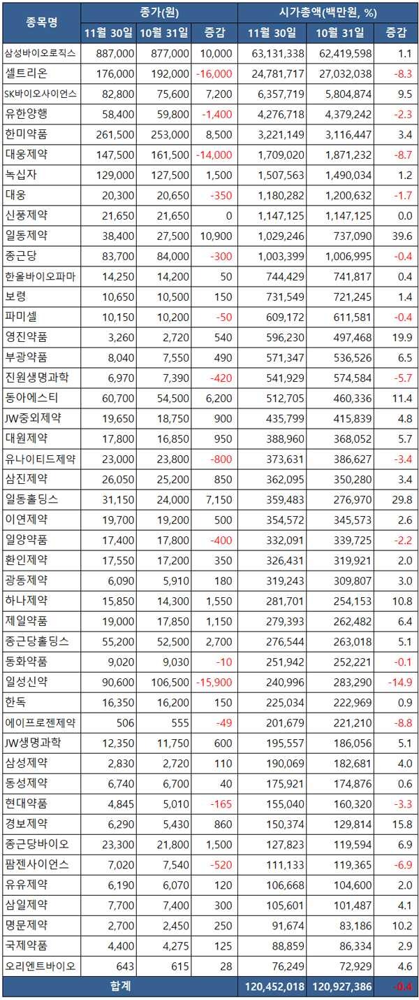 메디팜스투데이가 의약품업종 46개 종목의 시가총액(이하 시총)을 살펴본 결과 11월 마지막날인 30일 종가기준 시총규모는 120조 4520억원으로, 전월 마지막 거래일인 10월 31일 120조 9274억원보다 0.4% 감소했다.