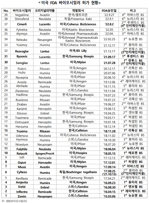 미국 FDA 허가된 바이오시밀러는 2022년 11월 17일 기준 39개로 올해에만 6개가 허가됐다. 39개중 4개는 상호교체가능 바이오시밀러(Interchangeable Biosimilar)이다.