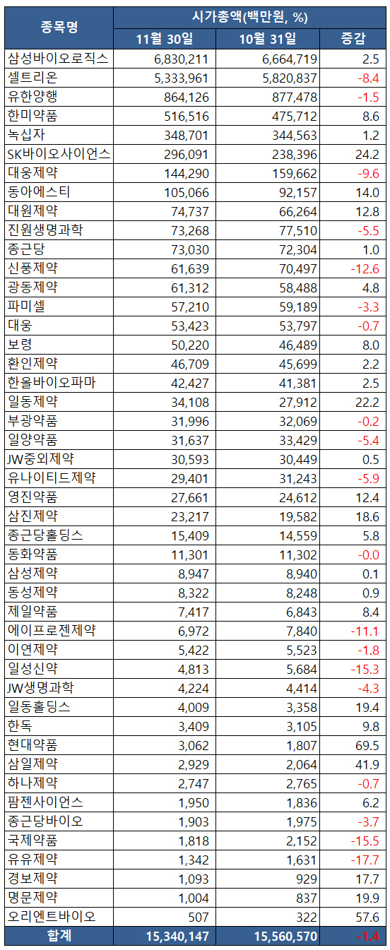 삼성바이오로직스는 전월 6조 6647억원에서 6조 8302억원으로 2.5% 증가했다. 금액으로는 1655억원이 증가했다. 셀트리온은 5조 8208억원에서 5조 3340억원으로 8.4% 감소했다. 금액으로는 4869억원이 줄어, 전체 시총 감소 폭에 영향을 끼쳤다.