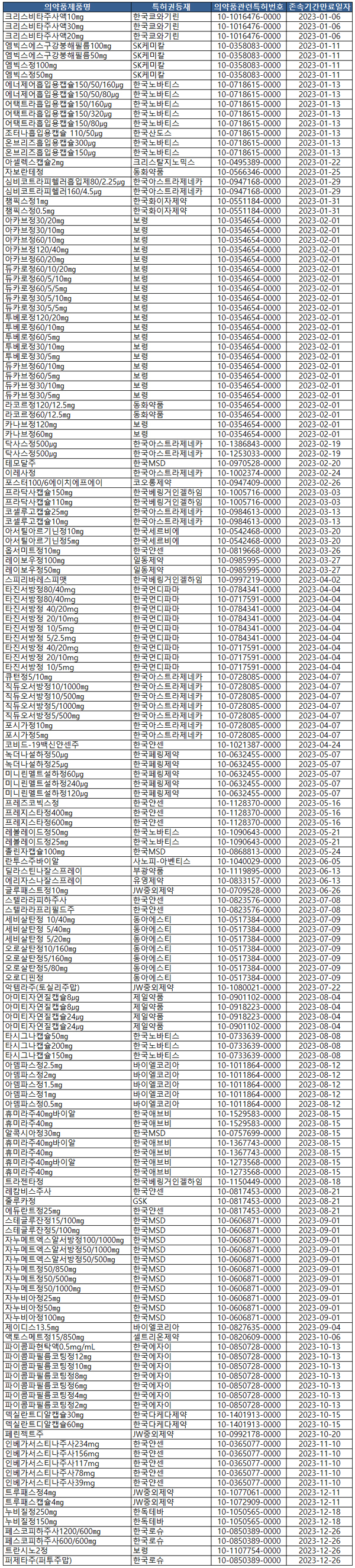 4월에는 베링거인겔하임의 스피리바레스피맷, 먼디파마의 타진서방정, 아스트라제네카의 큐턴정·직듀오서방정·포시가정, 얀센의 코비드-19백신얀센주의 특허가 만료되며, 5월에는 페링제약의 녹더나설하정·미니린멜트설하정, 얀센의 프레즈코빅스정·프로제스타정, 노바티스의 레볼레이드정, MSD의 졸린자캡슐의 특허가 만료될 예정이다.
