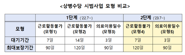 당초 1단계 시범사업은 고용주의 유급병가와 연계할 수 있도록 14일의 대기기간 모형을 운영하였으나, 2단계 시범사업에서는 대상자들의 특성상 현실적으로 유급병가를 적용받기 어려운 점을 반영하여 비교적 단기의 대기기간(3일, 7일) 모형을 운영할 예정이다.