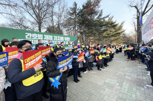 오늘(9일) 국회 보건복지위원장 직권으로 간호법안 본회의 상정 소식에 전해지면서 간호법안 반대를 주장하는 의료계 단체들이 국회 앞으로 나섰다.