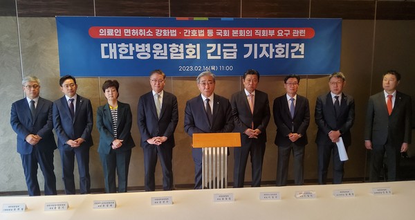 대한병원협회가 16일 기자회견을 개최하고 의료인 면허 취소 강화법과 간호법 제정안 철회를 위해 적극 대항할 것을 천명했다.