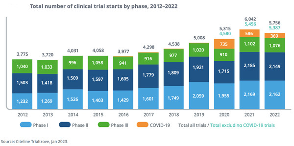 2022년 코로나19가 임상시험에 영향을 미쳤지만, 비코로나19 연구는 2022년과 2021년 사이 1% 감소에 그쳤다.