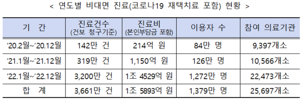 비대면 진료가 처음 허용된 2020년 2월 24일 이후 25,697개 의료기관에서 총 1379만 명을 대상으로 3661만 건의 비대면 진료가 실시되었다.