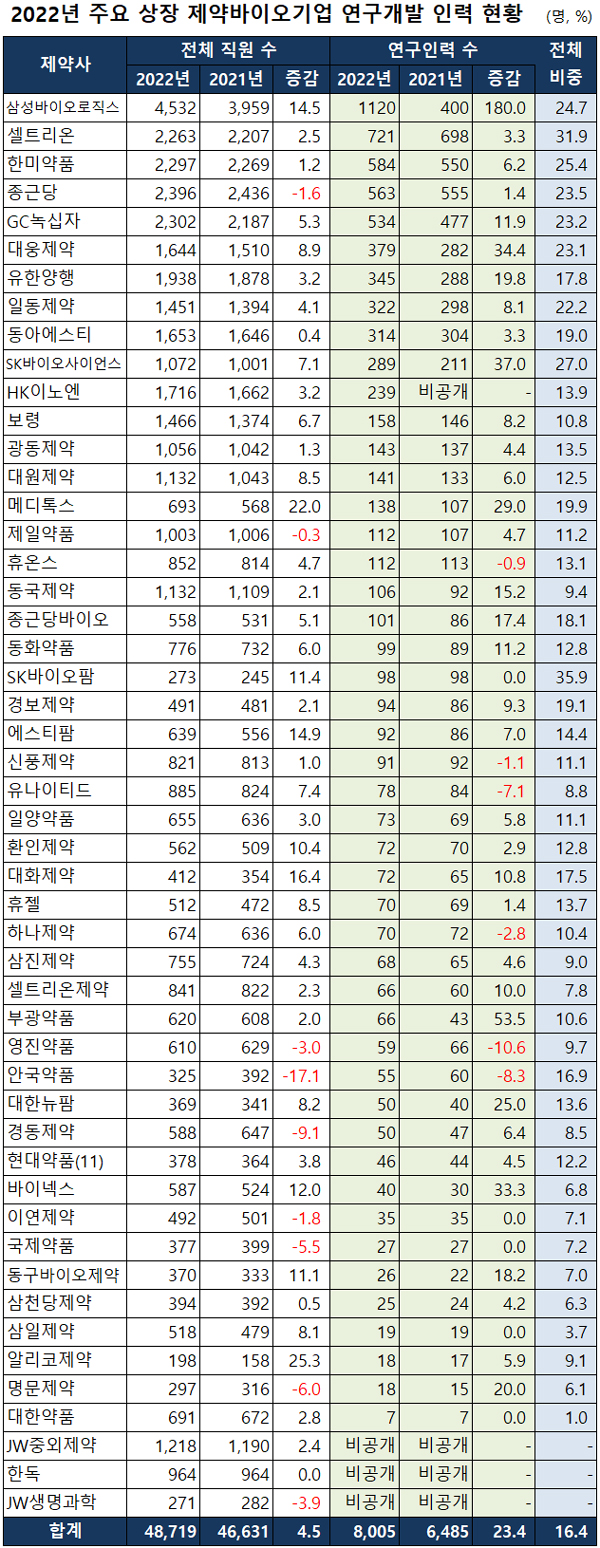 이는 전체 직원 수가 전년 4만 6631명에서 지난해 4만 8719명으로 4.5% 증가한 것보다 훨씬 더 높은 수치다. JW중외제약, 한독, JW생명과학 등 3곳은 연구인력을 따로 게재하지 않아 집계에서 제외됐다.