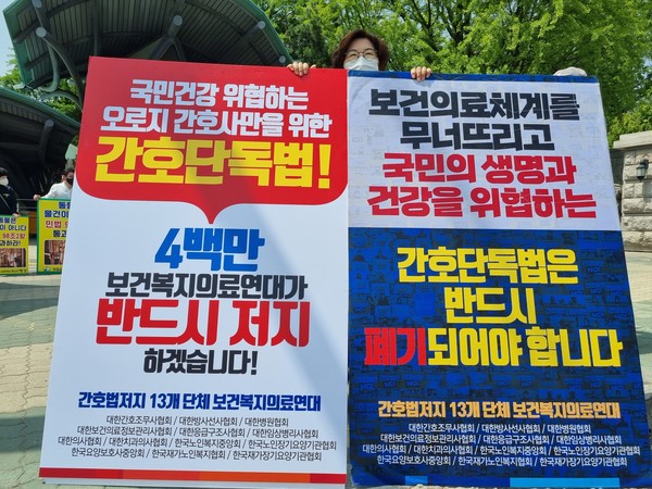 이를 저지하기 위해 13개 단체 보건복지의료연대 소속 임원들이 국회 앞 릴레이 1인시위에 나서 악법 규탄의 목소리를 높이고 있다.