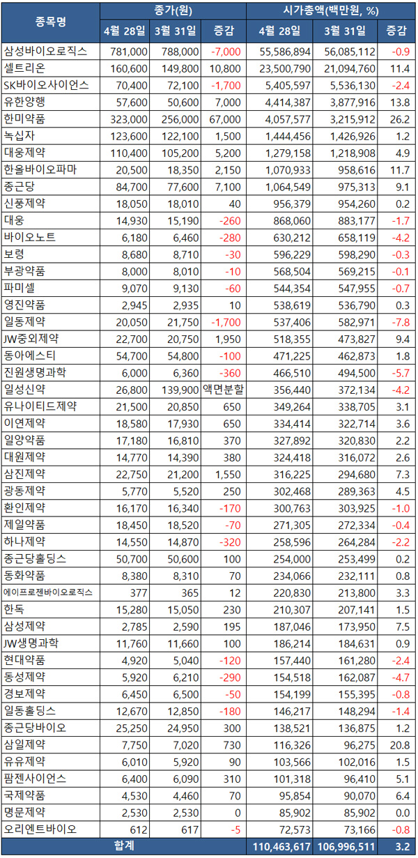 메디팜스투데이가 유가증권시장 의약품업종 47개사의 시가총액을 살펴본 결과, 4월 28일 종가기준 시총규모는 110조 4636억원으로, 3월 31일 106조 9965억원 대비 3.2% 증가했다. 금액으로는 3조 4671억원이 늘었다.