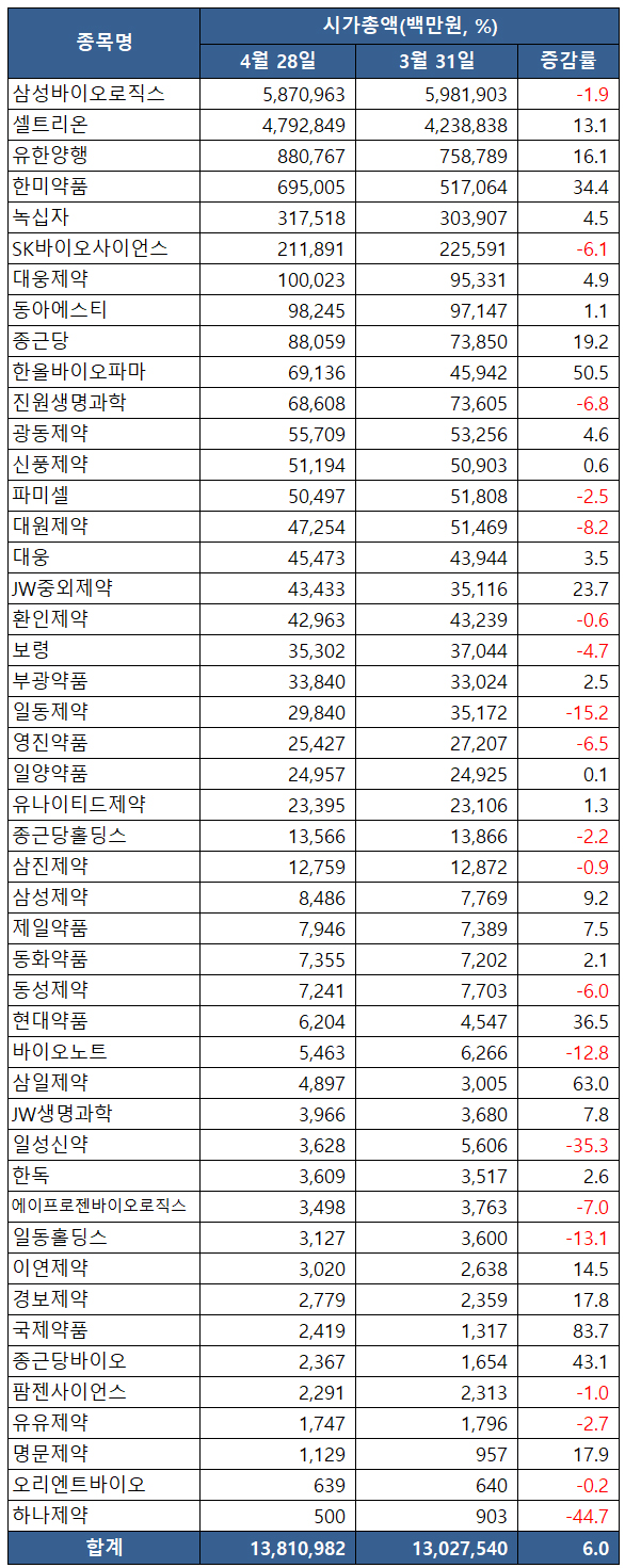 메디팜스투데이가 유가증권시장 의약품업종 종목 47개사의 외국인 보유지분 시가총액을 살펴본 결과 4월 28일 종가기준 외국인 시총규모는 13조 8110억원으로, 3월 31일 13조 275억원에 비해 6.0% 증가했다. 금액으로는 7834억원이 늘었다.