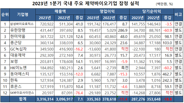 메디팜스투데이가 금융감독원에 제출된 12개 국내 상장 제약바이오기업의 영업(잠정)실적을 살펴본 결과 전체 매출액은 3조 3163억원으로 전년 동기 3조 969억원 대비 7.1% 증가했다.