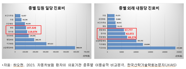 최근 하오현 부산디지털대학교 보건행정학과 교수가 발표한 ‘자동차보험 환자의 의료기관 종류별 이용실적 비교분석’ 논문에 따르면, 2016년~2020년 5년간 자동차보험 진료비를 의료기관 종별로 비교한 결과, 입원 일당과 외래 내원당 진료비 모두 의과보다 한의과가 더 높았다.