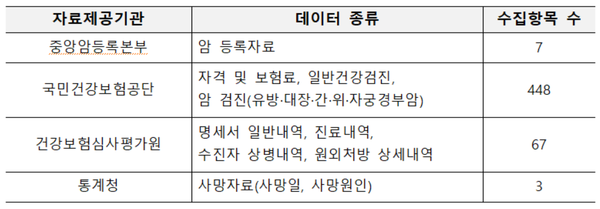 K-CURE 암 공공 라이브러리는 ‘암관리법’에 따라 국립암센터가 주관해 ▲통계청의 사망 정보 ▲중앙암등록본부의 암 등록자료 ▲국민건강보험공단의 자격·검진정보 ▲건강보험심사평가원의 의료이용 청구정보 등을 결합한 2012년부터 2019년까지 등록된 암 환자 198만 명 규모의 빅데이터로, 암 진단 이전부터 사망에까지 이르는 암 환자 전 주기 데이터를 포함한다.