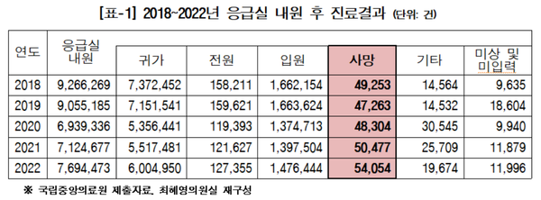 더불어민주당 최혜영 국회의원(보건복지위원회)이 국립중앙의료원으로부터 제출받은 자료에 따르면, 2018년부터 2022년까지 지난 5년간 응급실 내원 건수는 2018년 926만 6269건에서 2022년 769만 4473건으로 꾸준히 감소했다.