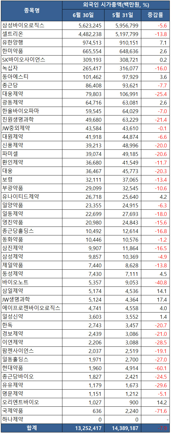 메디팜스투데이가 유가증권시장 의약품업종 종목 47개사의 외국인 보유지분 시가총액을 살펴본 결과 6월 30일 종가기준 외국인 시총규모는 13조 2524억원으로, 5월 31일 14조 3892억원에 비해 7.9% 감소했다. 금액으로는 1조 1368억원이 줄었다.