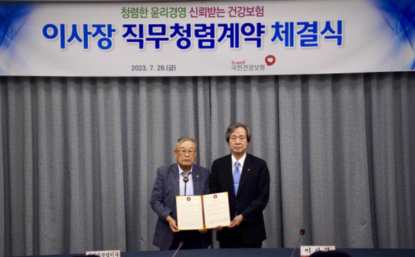 국민건강보험공단은 28일 제7회 이사회를 개최해 정기석 신임 이사장과 박용열 선임비상임이사 간 청렴하고 공정한 업무수행을 약속하는 직무청렴계약을 체결했다.