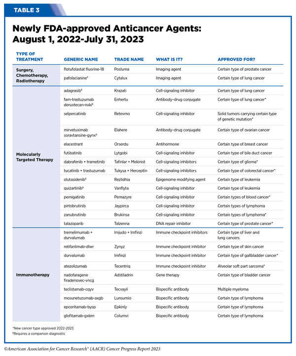 보고서에 따르면, 2022년 8월 1일부터 2023년 7월 31일까지 미국 FDA에서 승인된 새로운 항암제는 14개로, 이는 방광암에 대한 유전자 치료 기반 면역 치료제, 난소암에 대한 첫 항체 약물 접합체, 혈액암에 대한 4개의 새로운 T세포 관여 이중 특이 항체 등이다.