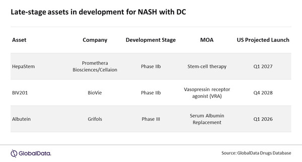 DC를 가진 NASH 환자의 치료에 평가되고 있는 3가지 파이프라인 약품은 프로메테라 바이오사이언스(Promethera Biosciences)와 셀라이온(Cellaion)의 헤파스템(HepaStem), 바이오비(BioVie)의 BIV201(연속 주입 terlipressin), 그리폴스(Grifols)의 알부테인(Albutein, albumin-human injection) 등이다.