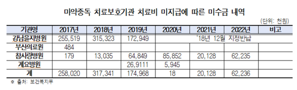 더불어민주당 한정애 국회의원(서울 강서병, 국회 보건복지위원회)이 보건복지부로부터 제출받은 국정감사 자료 ‘마약중독 치료보호기관 치료비 지급내역’에 의하면, 보건복지부가 마약중독치료기관에 지급해야 할 치료비를 연례적으로 체납한 것으로 확인됐다.