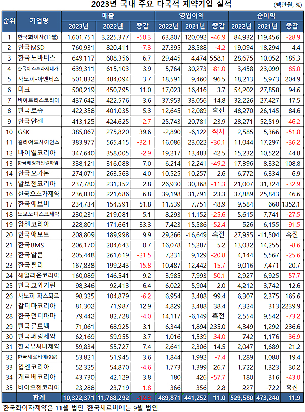 35개사 중 11월 법인인 한국화이자제약과 길리어드사이언스코리아는 2022년 코로나19 백신과 치료제로 특수를 누렸던 매출이 급감하며 저조한 실적을 보였다.