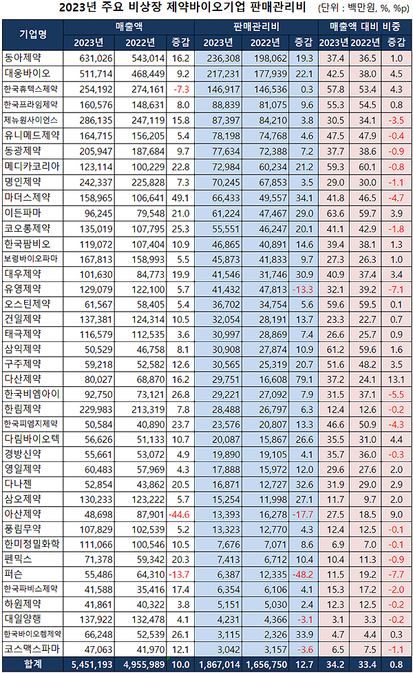동아제약과 대웅바이오는 2000억원 이상의 판관비를 지출해 독보적으로 많았으며, 이든파마와 삼익제약은 매출액 대비 판관비 비중이 60%를 넘어 가장 높았다.