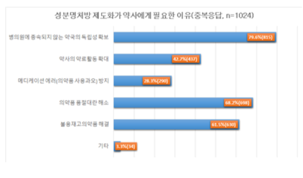 이번 설문에서 응답 회원들은 약사에게 성분명처방의 제도화가 필요한 이유로 병의원에 종속되지 않는 약국의 독립성 확보(79.6%)를 손꼽았다(중복응답).