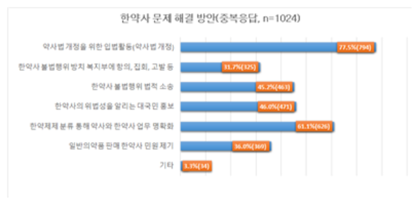 한약사의 불법성을 알리는 대국민 홍보(46.0%), 한약사의 불법법위에 대한 법적 소송(45.2%) 등이 필요하다는 의견도 적지 않았다.