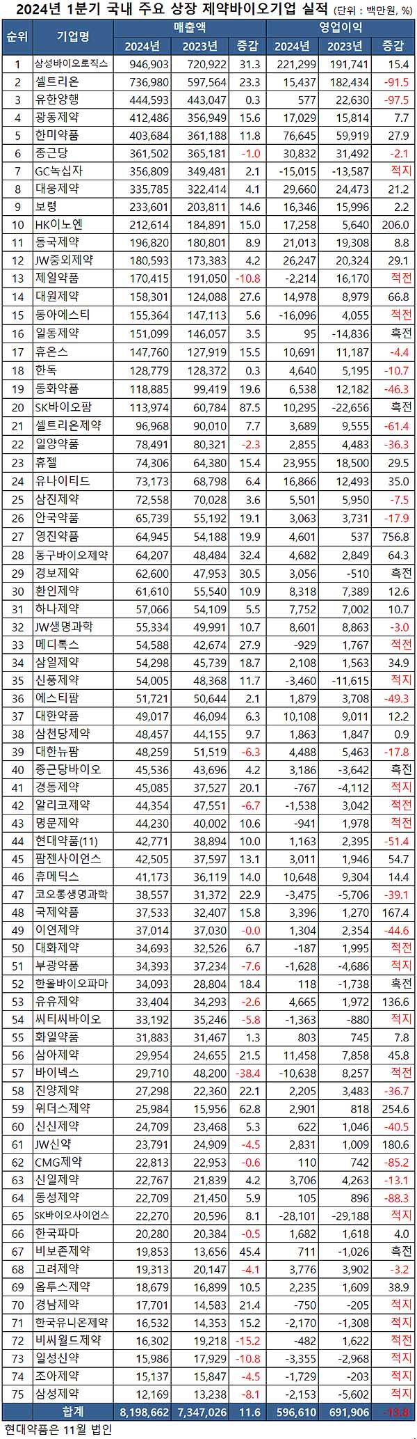 메디팜스투데이가 금융감독원에 제출된 2024년 분기보고서를 토대로 국내 75개 상장 제약바이오기업의 1분기 실적을 살펴본 결과 매출은 8조 1987억원으로, 전년 동기 7조 3470억원 대비 11.6% 증가했다.