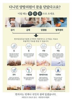 대한한의사협회는 “대한민국의 한의원은 이번에 포스터로 제작·배포되는 4가지 질환 이외에도 일차의료, 필수의료에 강점을 가지고 있으며, 특히 해당 질환들은 건강보험이 적용되는 침과 뜸, 부항, 추나, 보험용 한약제제를 활용해 적은 부담으로 충분히 한의원에서 치료 가능하다”며 “한의원에 내원하시면 적절한 진단과 치료를 받으실 수 있다는 것을 널리 알림으로써 의료공백에 따른 국민들의 불안과 불편함을 최소화한다는 차원에서 이번 포스터를 제작·배포하게 됐다”고 설명했다.