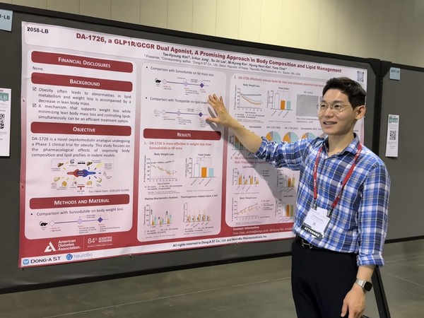 동아에스티(대표이사 사장 김민영)와 자회사 뉴로보 파마슈티컬스(NeuroBo Pharmaceuticals)는 지난 21일부터 24일까지 미국 올랜도 컨벤션센터에서 개최된 ‘제84회 미국 당뇨병학회(American Diabetes Association, ADA)에서 비만 치료제 ‘DA-1726’의 전임상 연구 결과를 포스터 발표했다고 24일 밝혔다.