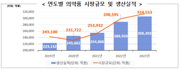 이는 수입·수출실적은 전년 대비 감소했으나 2023년 처음으로 30조원을 돌파한 생산실적(30조 6303억원)에 힘입어 국내 의약품 시장규모가 확대된 것으로 풀이된다.