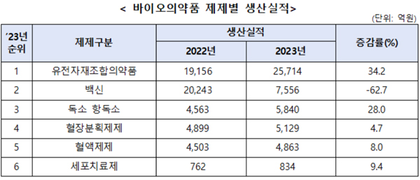 2023년 바이오의약품의 국내 생산실적은 코로나19 백신의 생산실적이 급감하며 4조 9,936억원으로 전년(5조 4,127억원) 대비 7.7% 감소했으나, 백신을 제외한 바이오의약품의 생산실적은 유전자재조합의약품, 독소·항독소, 혈액제제 등 다양한 제품 분야에서 고른 성장세를 보였다.
