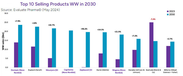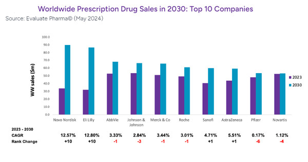 릴리와 노보 노디스크의 5개 비만과 당뇨병 치료제가 2030년까지 톱 10 베스트셀링 약물을 지배할 전망이다.