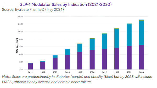 릴리의 티제파타이드(tirzepatide) 제품인 마운자로(Mounjaro)와 젭바운드(Zepbound)와 더불어, 노보의 세마글루타이드(semaglutide) 기반인 오젬픽(Ozempic), 위고비(Wegovy), 최신 후보 약물인 카그리세마(CagriSema)는 총매출 1000억 달러 이상으로 2030년까지 글로벌 매출 톱10 약물 순위의 일부를 차지할 것으로 예상된다.