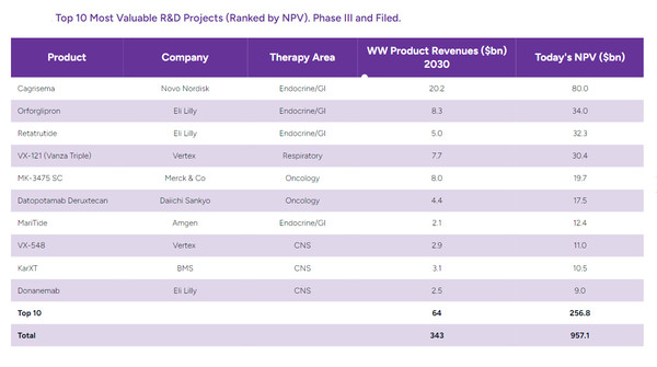 또한, 암젠의 마리타이드9MariTide)는 2030년까지 전 세계 매출 21억 달러와 NPV 124억 달러로 예상돼, 7위에 올랐다.